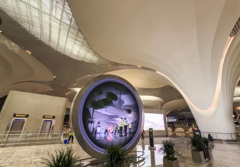 作为印度首个全数字化机场,NMIA在设计和运营中全面拥抱数字化转型,以提升旅客体验和运营效率。利亚德旗下高端品牌平达Planar®精准洞察项目需求,为其量身打造20个大小不一的圆形LED显示终端。依托LSIN及LSON系列产品的核心模块化技术优势,该终端通过高度定制化开发,兼具灵活适配性与轻便安装属性,搭配简约精致的包边设计,实现显示科技与建筑美学的融合,巧妙嵌入机场值机、安检、候机等多个关键区域,成为机场数字化场景的亮眼注脚。