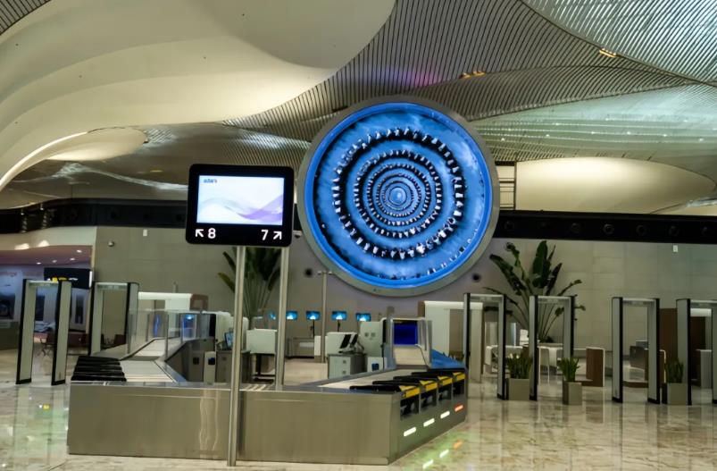 作为印度首个全数字化机场,NMIA在设计和运营中全面拥抱数字化转型,以提升旅客体验和运营效率。利亚德旗下高端品牌平达Planar®精准洞察项目需求,为其量身打造20个大小不一的圆形LED显示终端。依托LSIN及LSON系列产品的核心模块化技术优势,该终端通过高度定制化开发,兼具灵活适配性与轻便安装属性,搭配简约精致的包边设计,实现显示科技与建筑美学的融合,巧妙嵌入机场值机、安检、候机等多个关键区域,成为机场数字化场景的亮眼注脚。