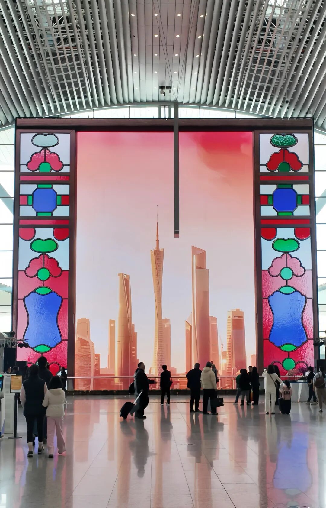 《广州之窗》将巨幕巧妙转化为一扇巨大的、充满呼吸感的动态满洲窗,从朝阳下的城市天际线到缀满木棉花的纪念堂,让旅客透过屏幕读懂广州的历史底蕴与现代活力。